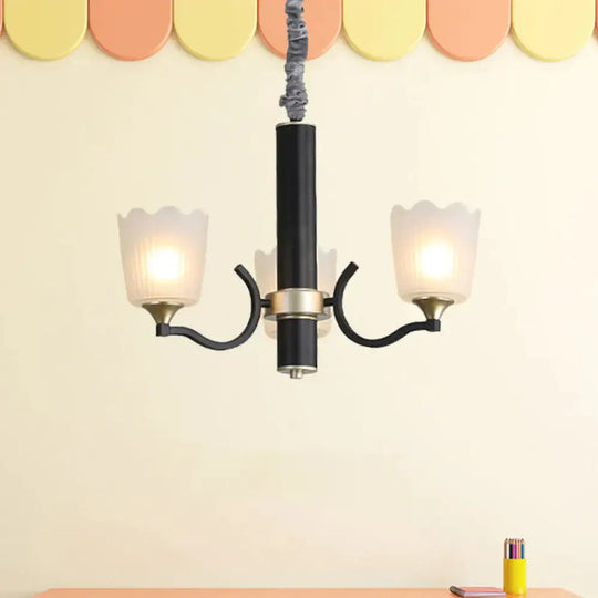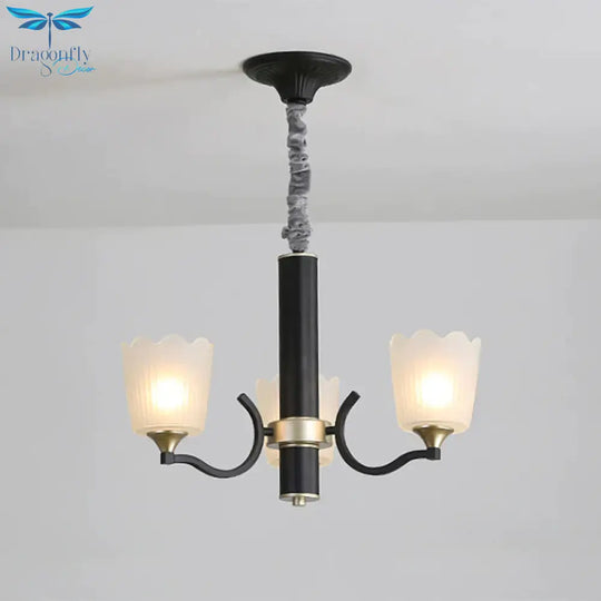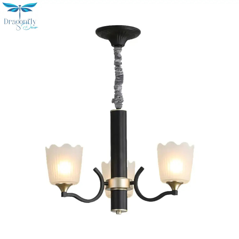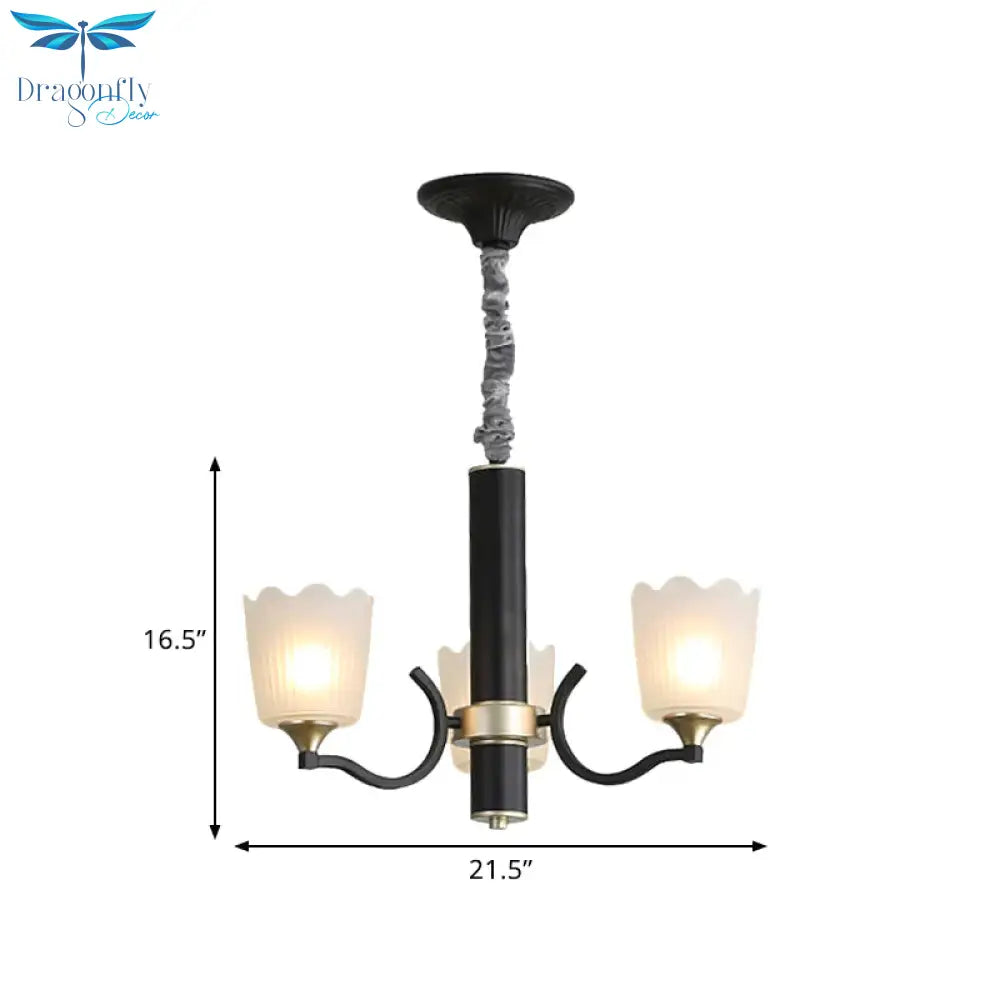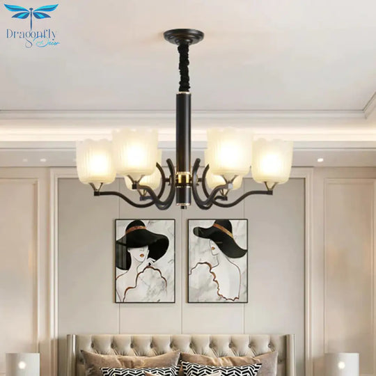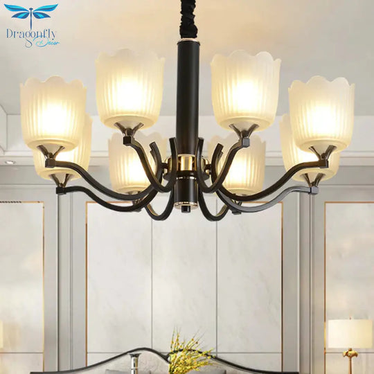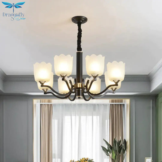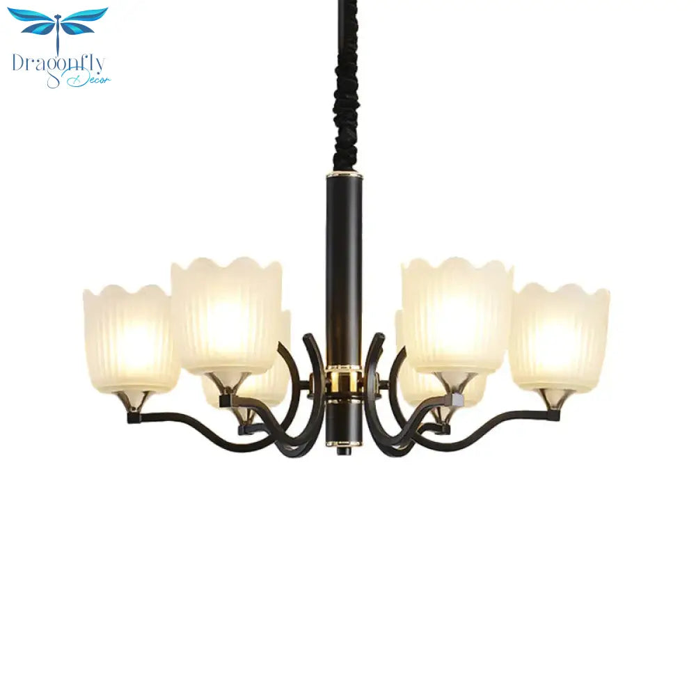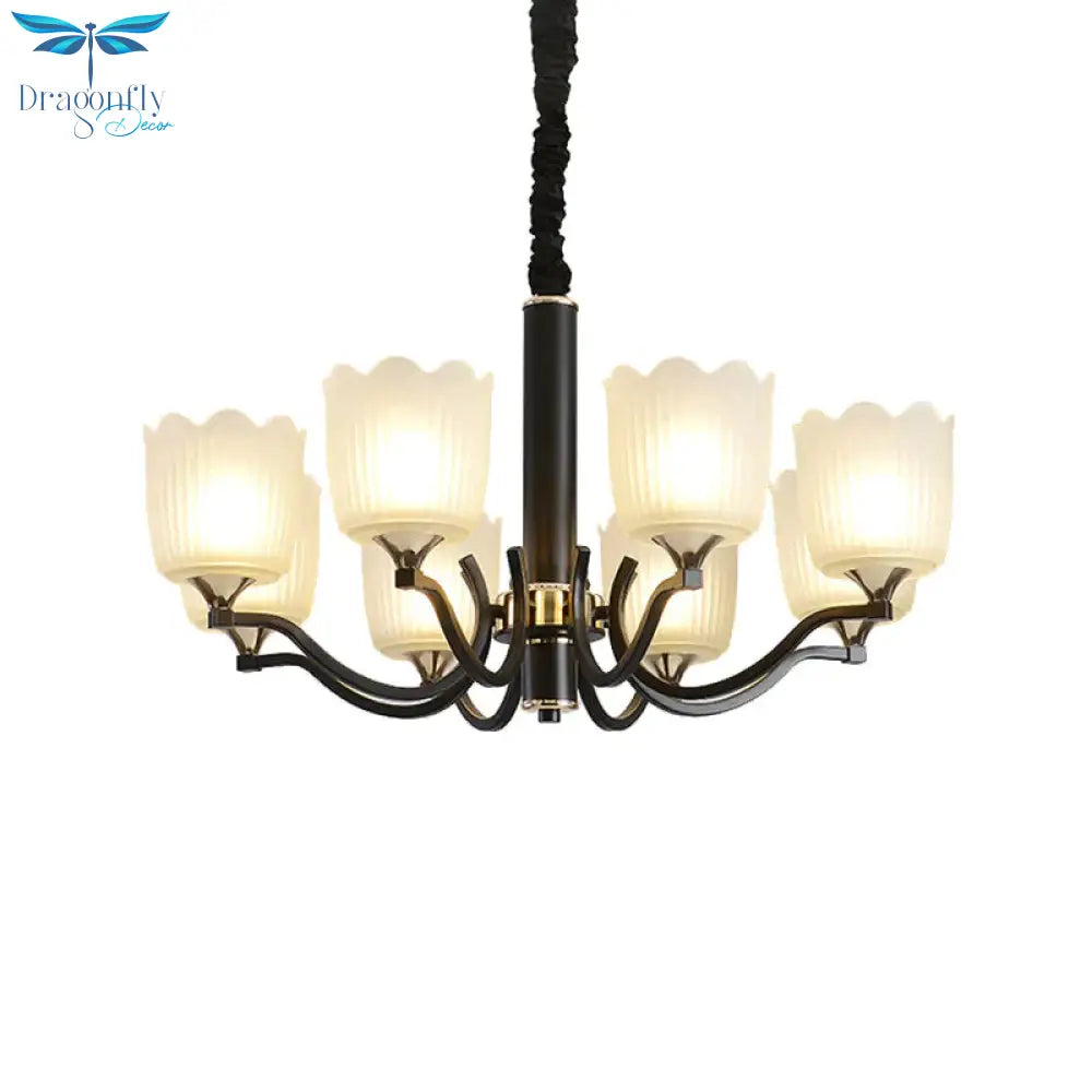 Scalloped Cup Shape Living Room Pendant Traditional Opal Ribbed Glass 3/6/8-Bulb Black Ceiling Chandelier