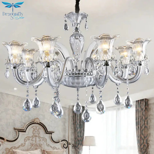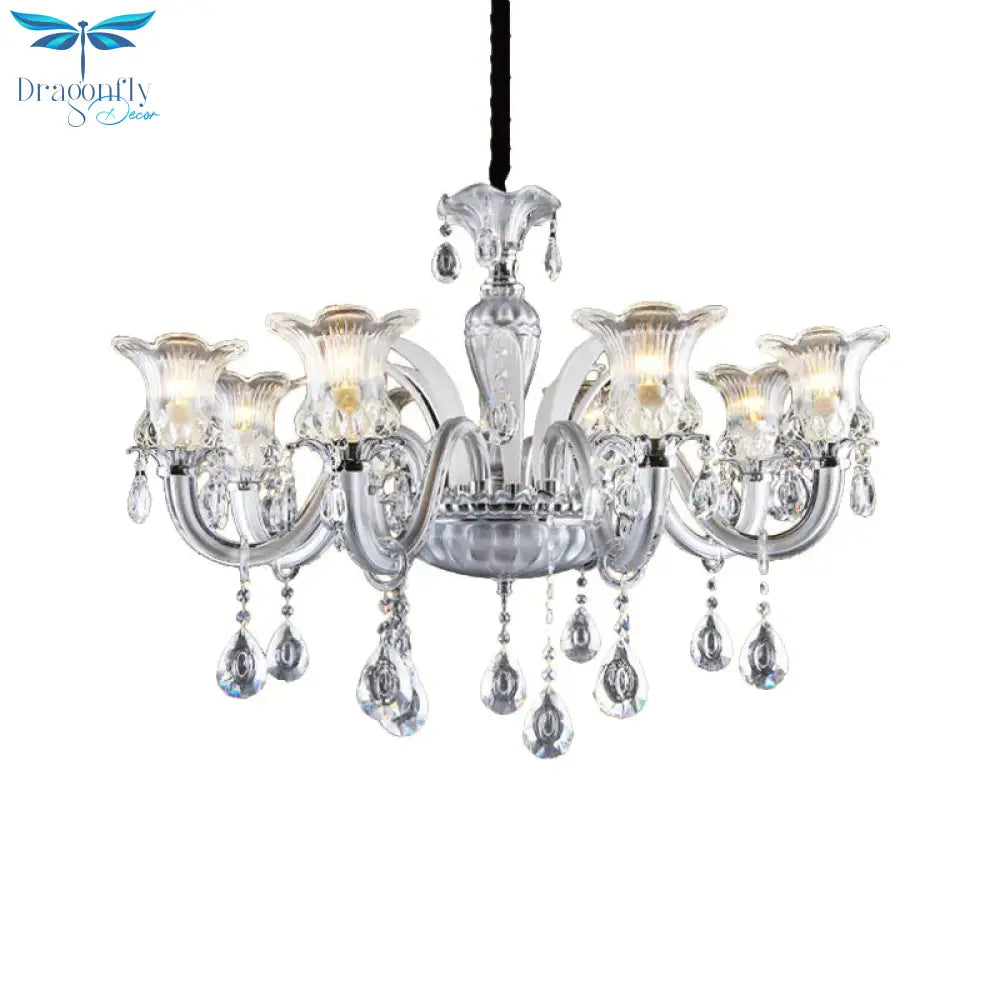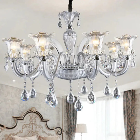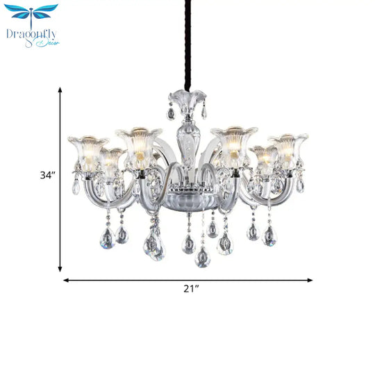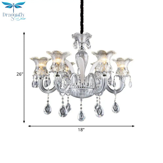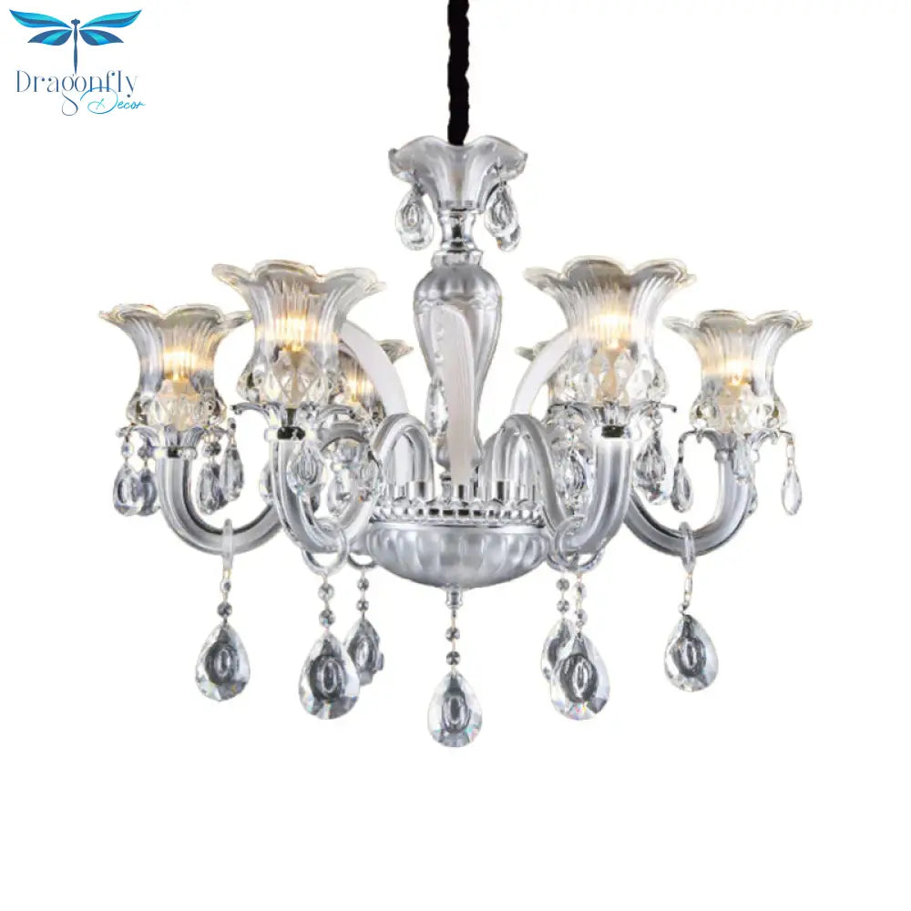 Silver 6/8 Lights Chandelier Light Traditional Clear Ribbed Glass Flower Pendant Lamp with Crystal Droplet