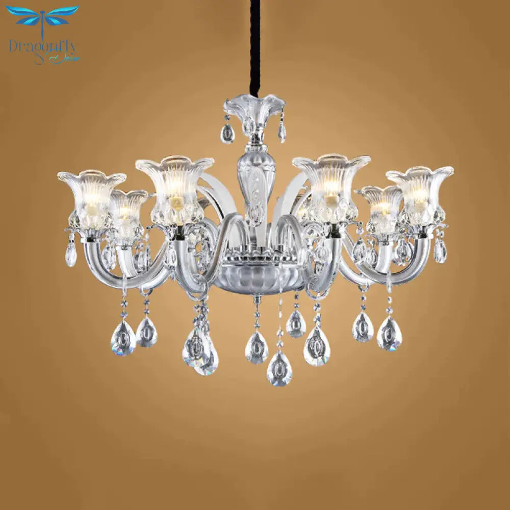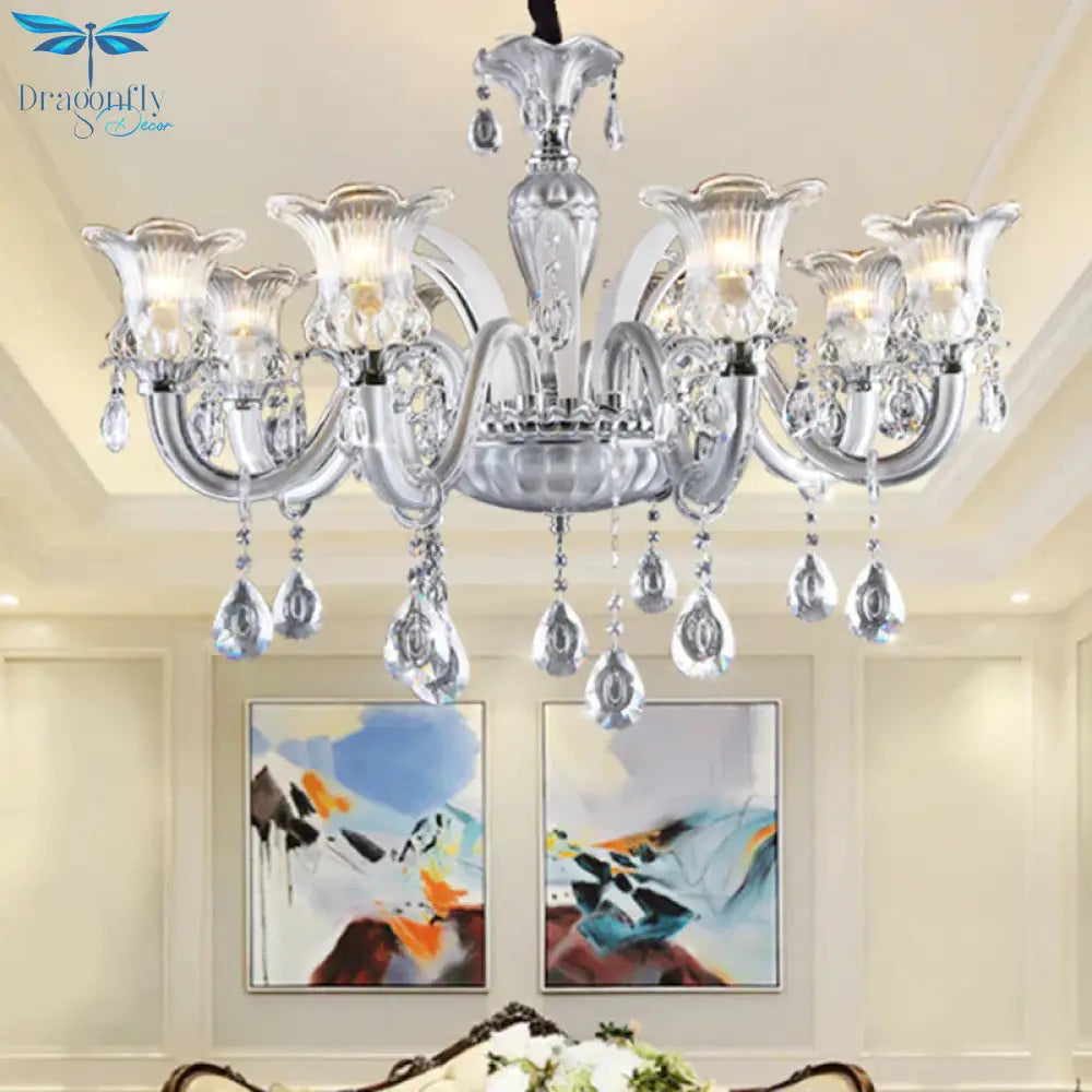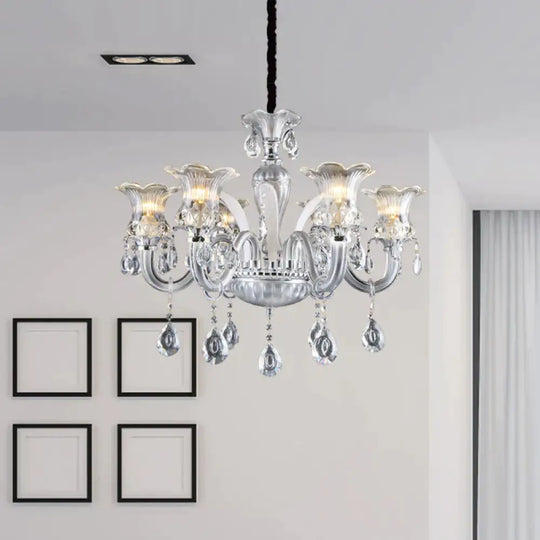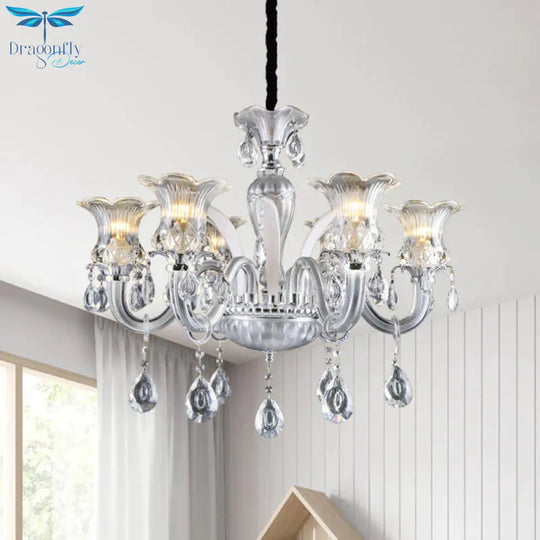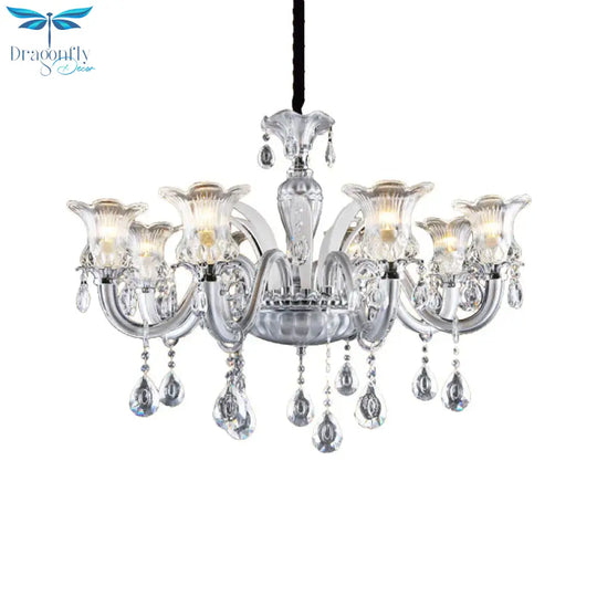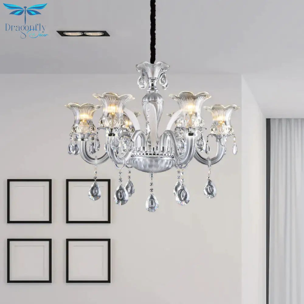 Silver 6/8 Lights Chandelier Light Traditional Clear Ribbed Glass Flower Pendant Lamp with Crystal Droplet