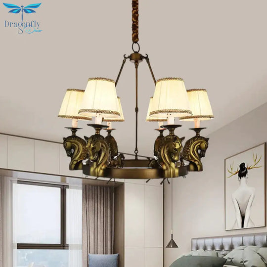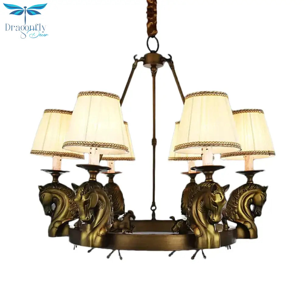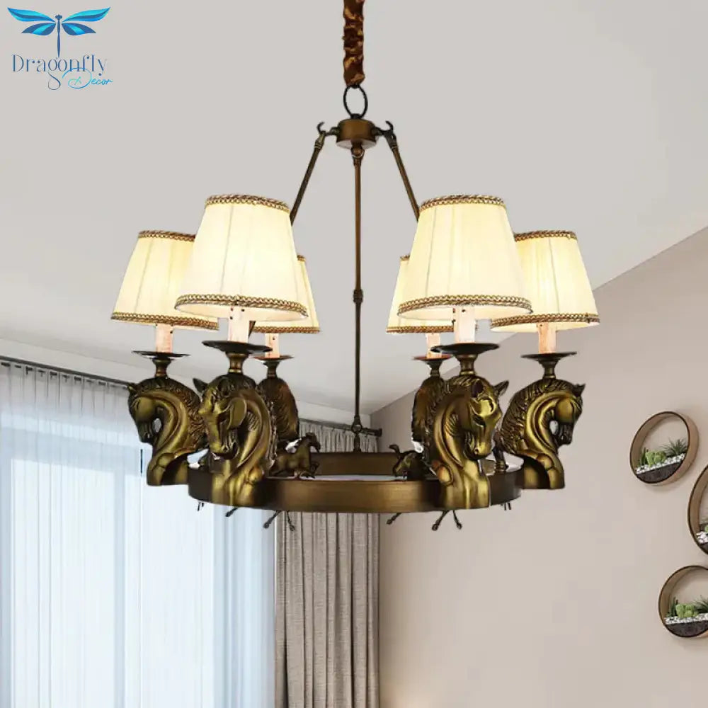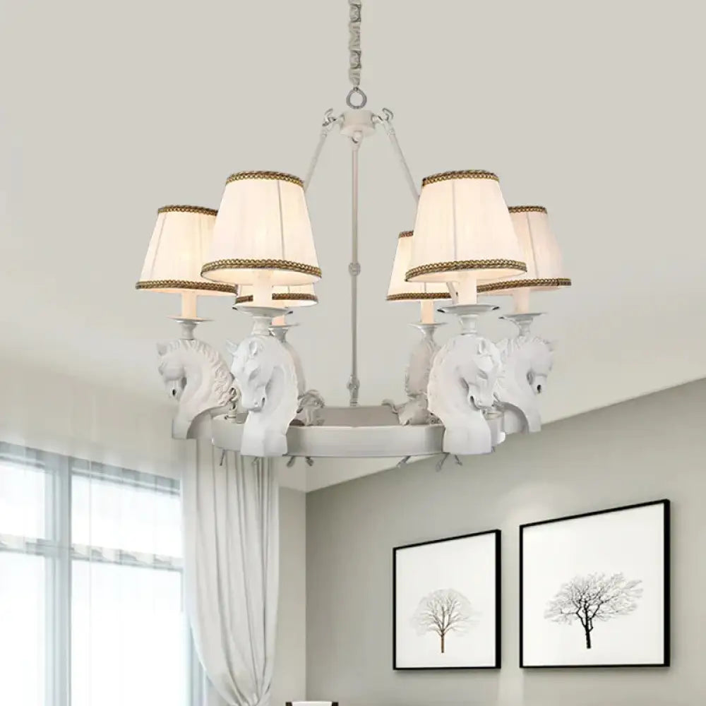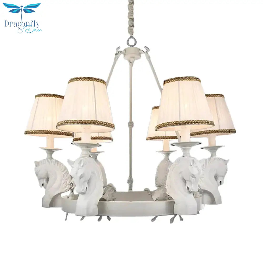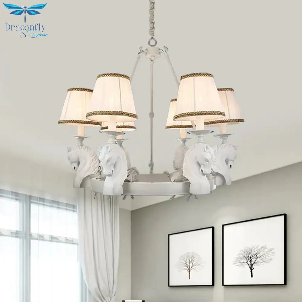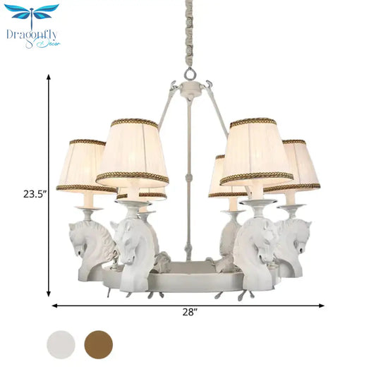 Tapered Fabric Chandelier Light Fixture Country 6 Heads Living Room Pendant Lamp in White/Bronze with Metal Horse Head Design