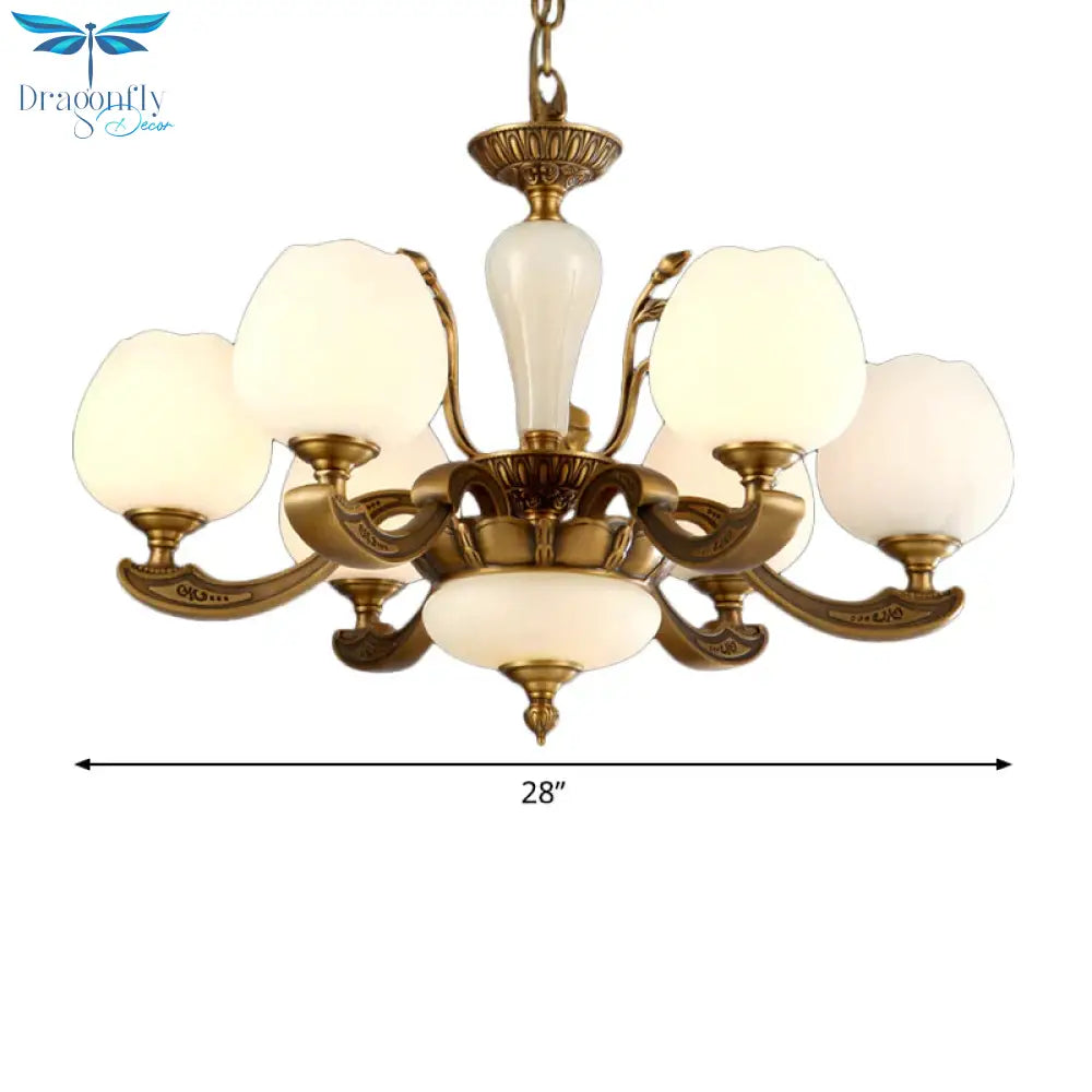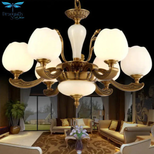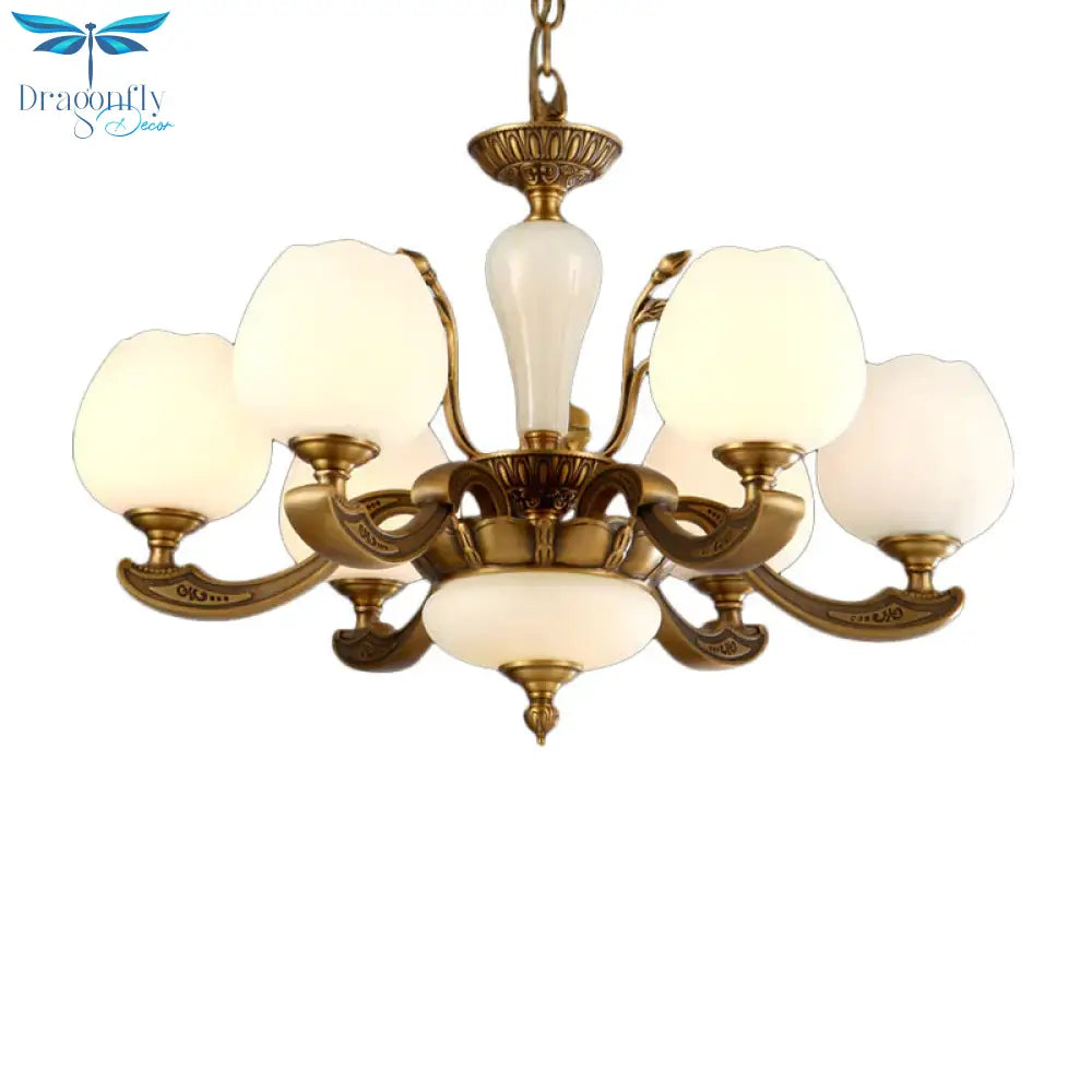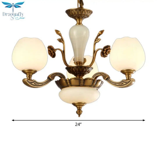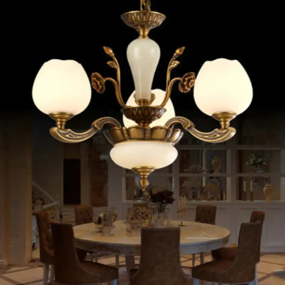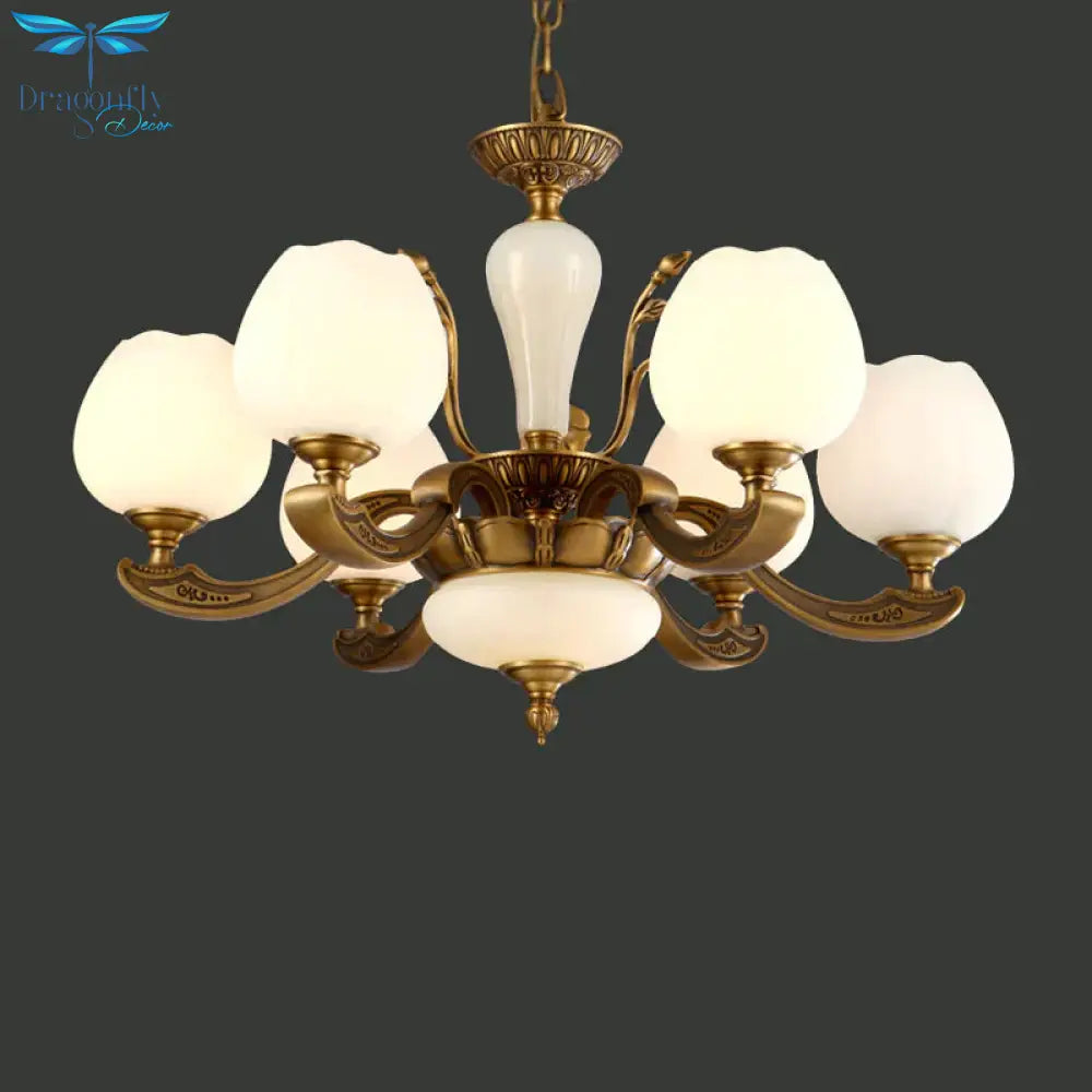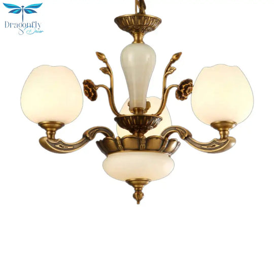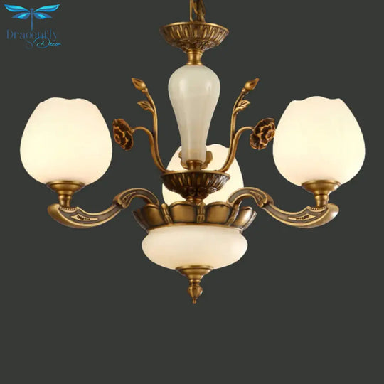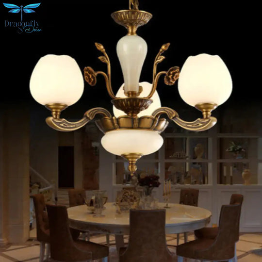 Traditional Bud Shaped Hanging Lamp 3/6 Lights Frosted White Glass Chandelier in Brass