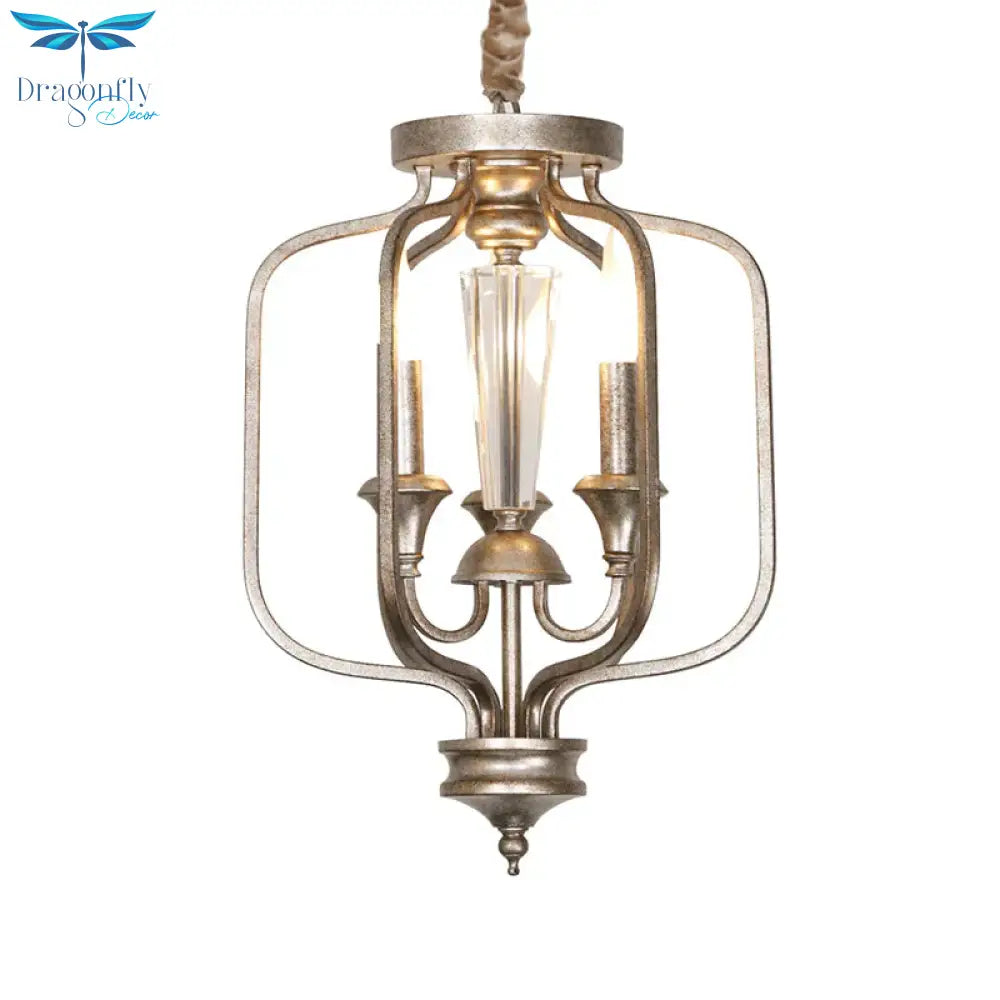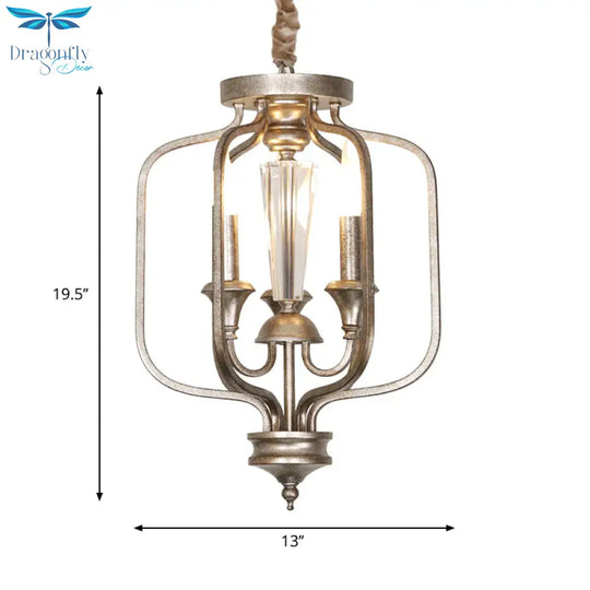 Traditional Caged Hanging Lamp 3 Bulbs Metal Chandelier Light Fixture with Crystal Accent in Aged Silver