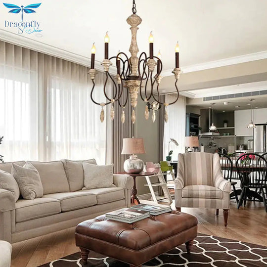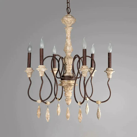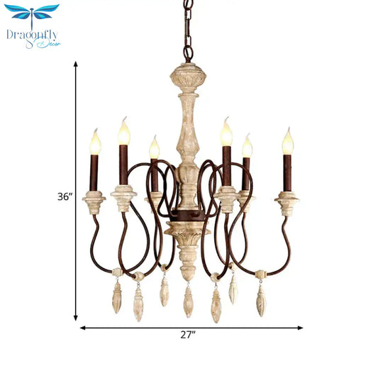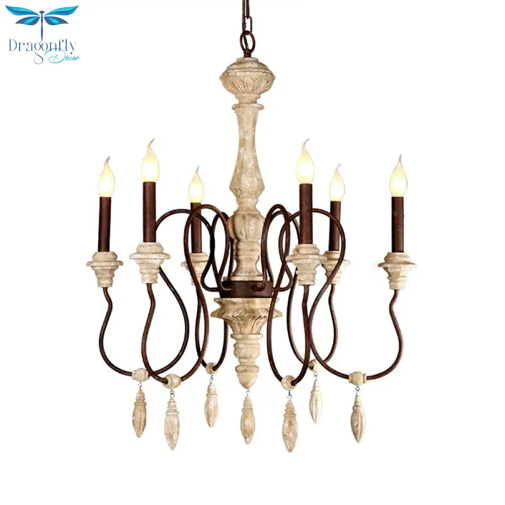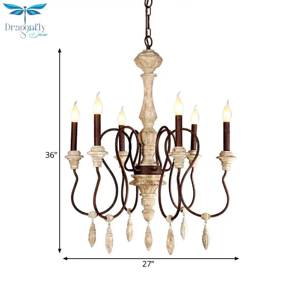 Traditional Candelabra Hanging Pendant 6 Lights Wooden Ceiling Chandelier in Ivory for Living Room