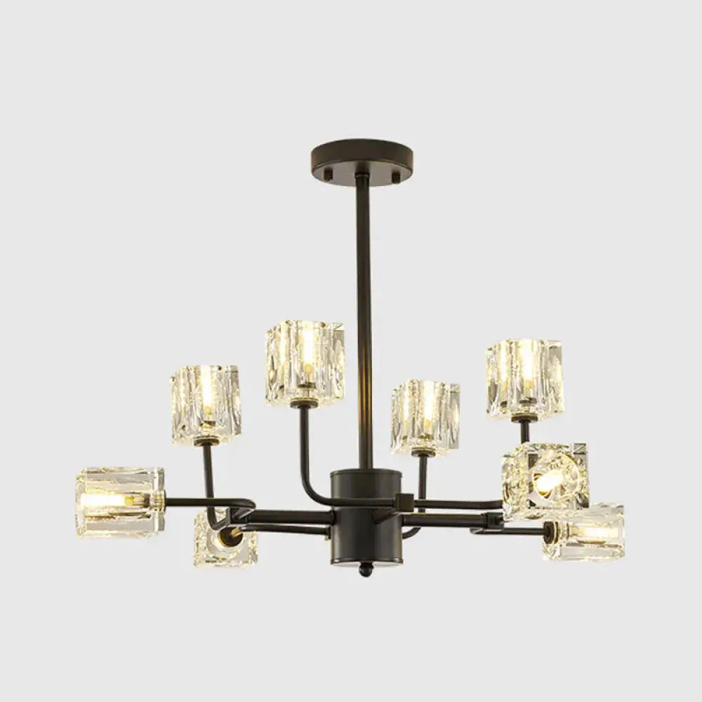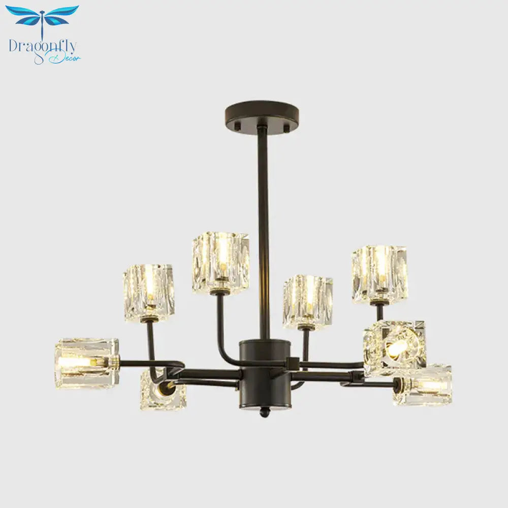 Traditional Cube Hanging Pendant 8 Heads Clear Crystal Glass Chandelier Lighting Fixture in Black/Gold