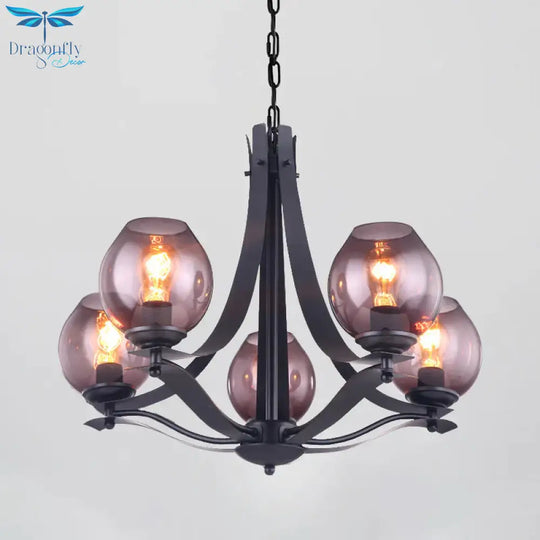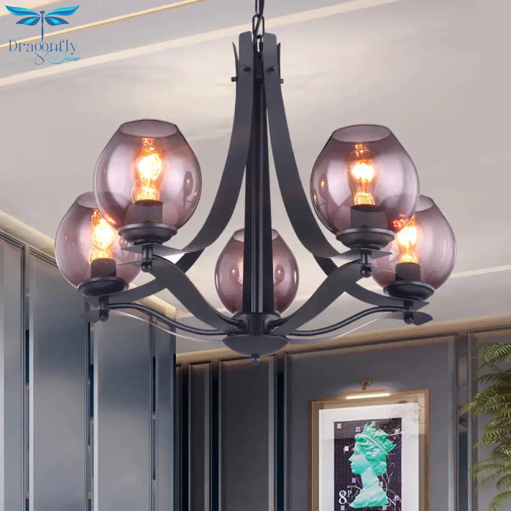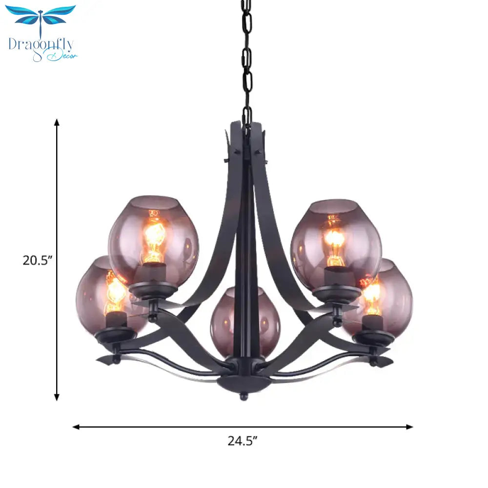 Traditional Cup Shaped Hanging Lighting 5 Heads Grey Glass Chandelier Pendant Lamp In Black