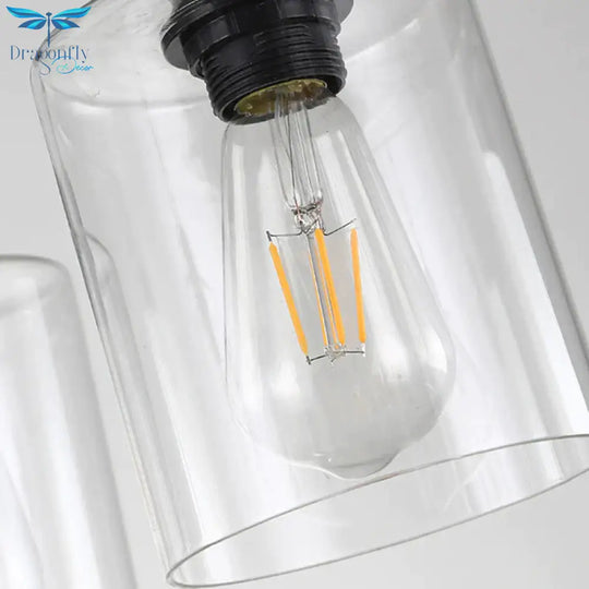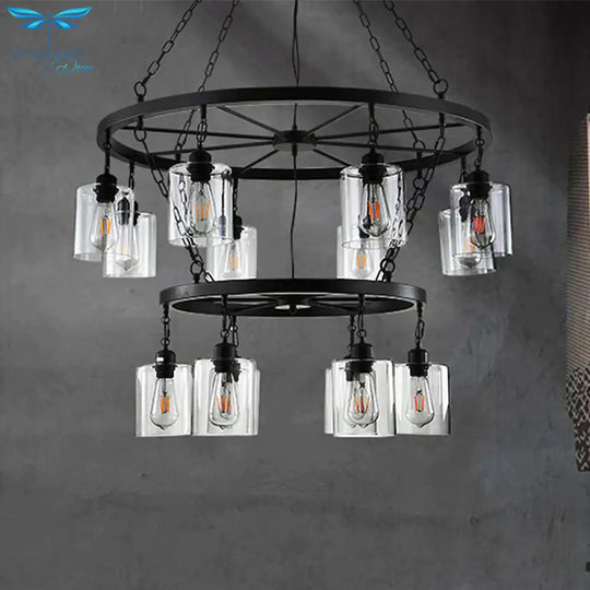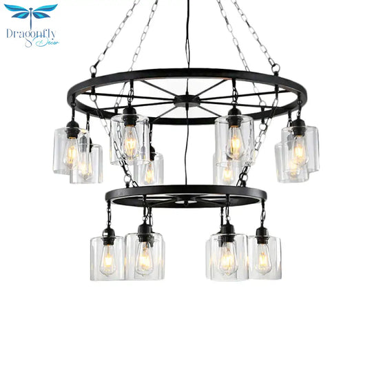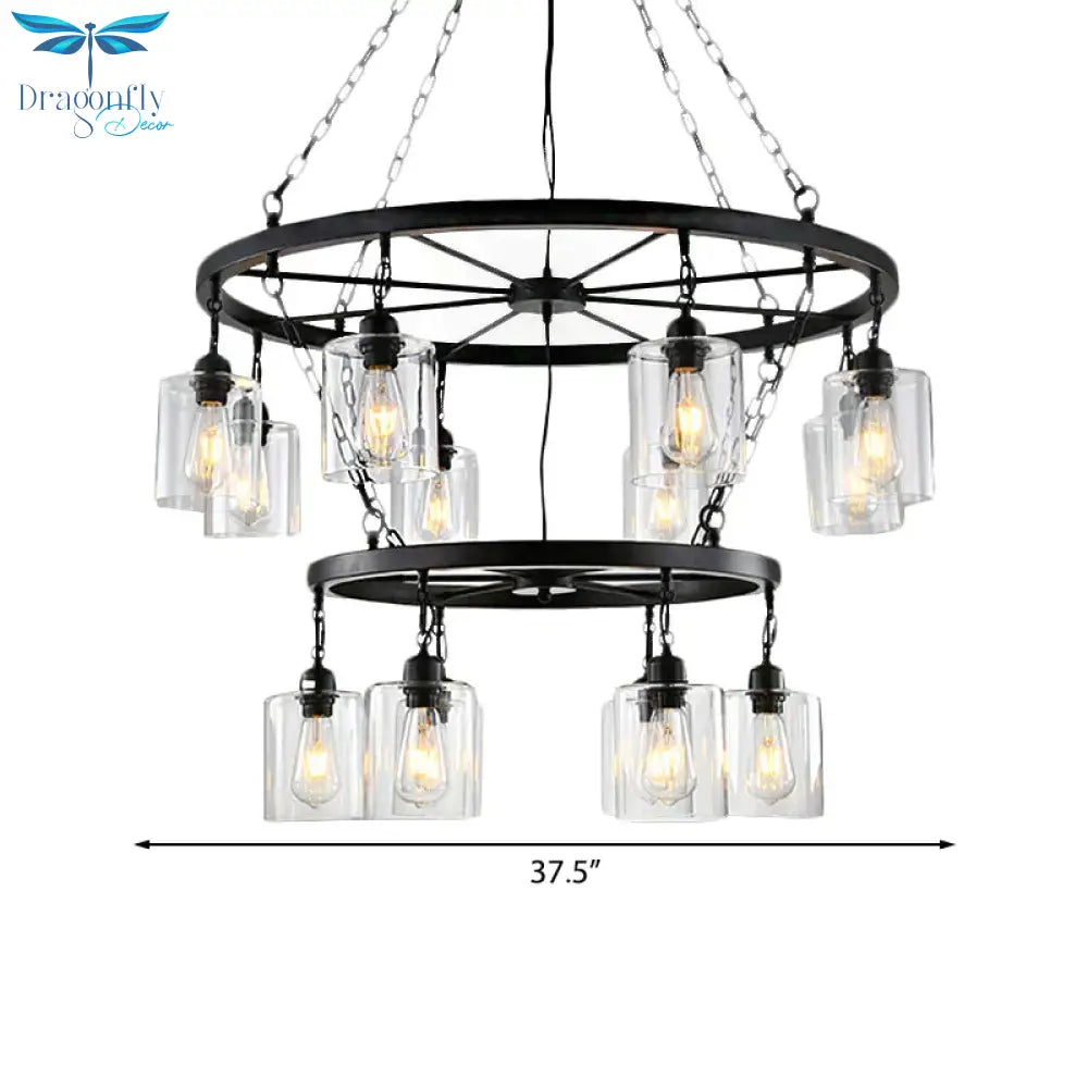 Traditional Two-Tiers 14 Lights Clear Glass Hanging Chandelier in Black with Cylinder Shade