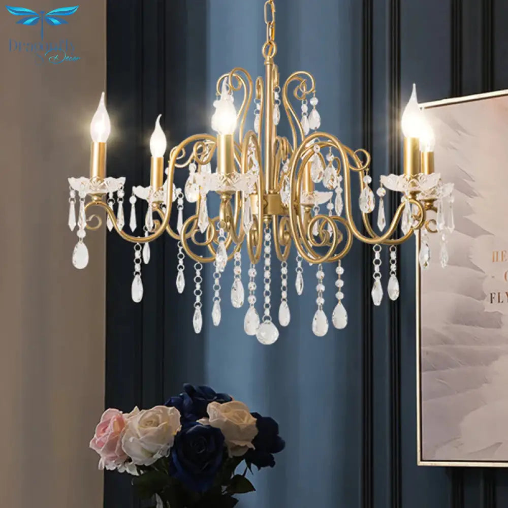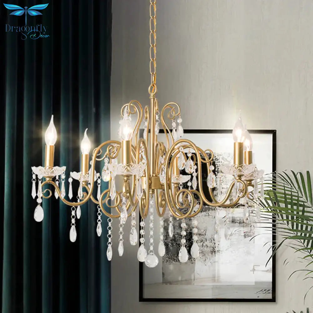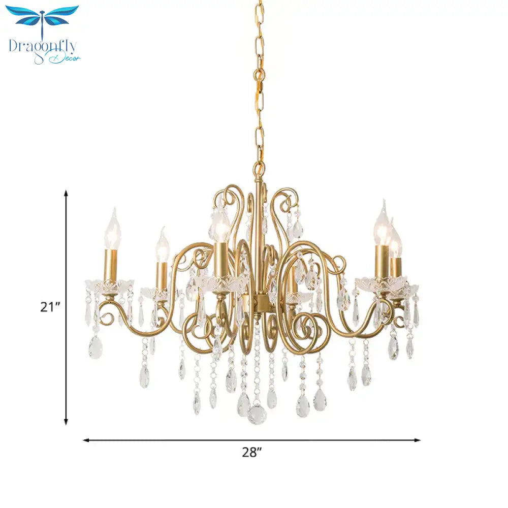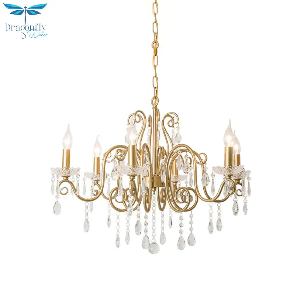 Victorian Swirl Arm Candelabra Chandelier 6 Bulbs Crystal Hanging Light Fixture in Gold