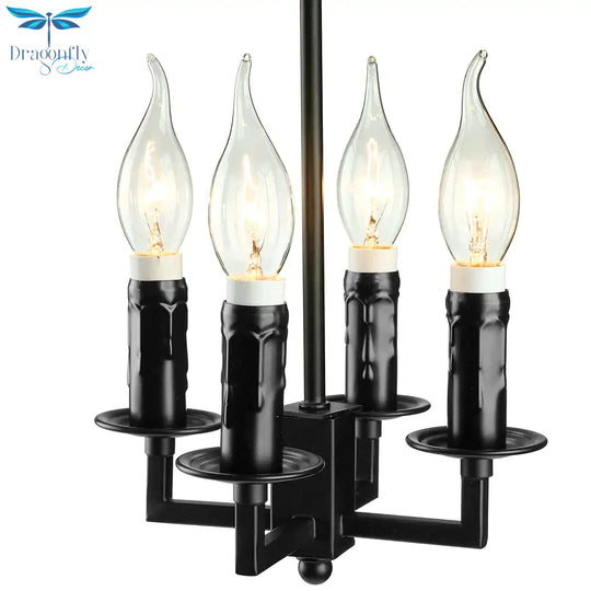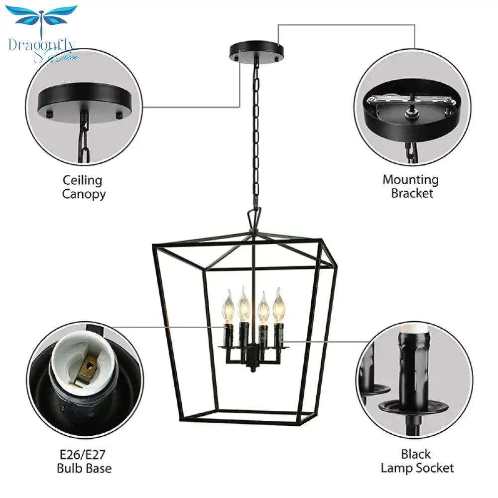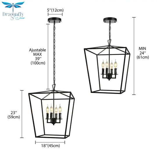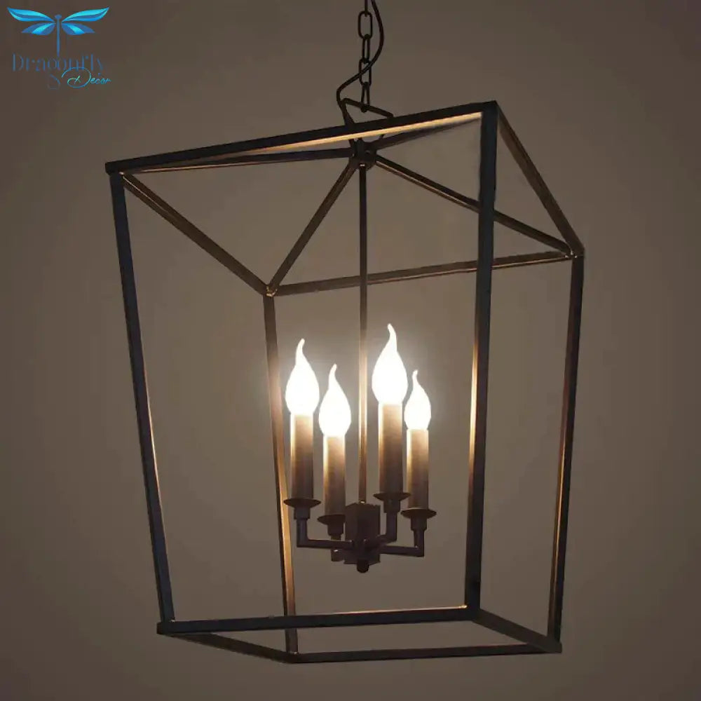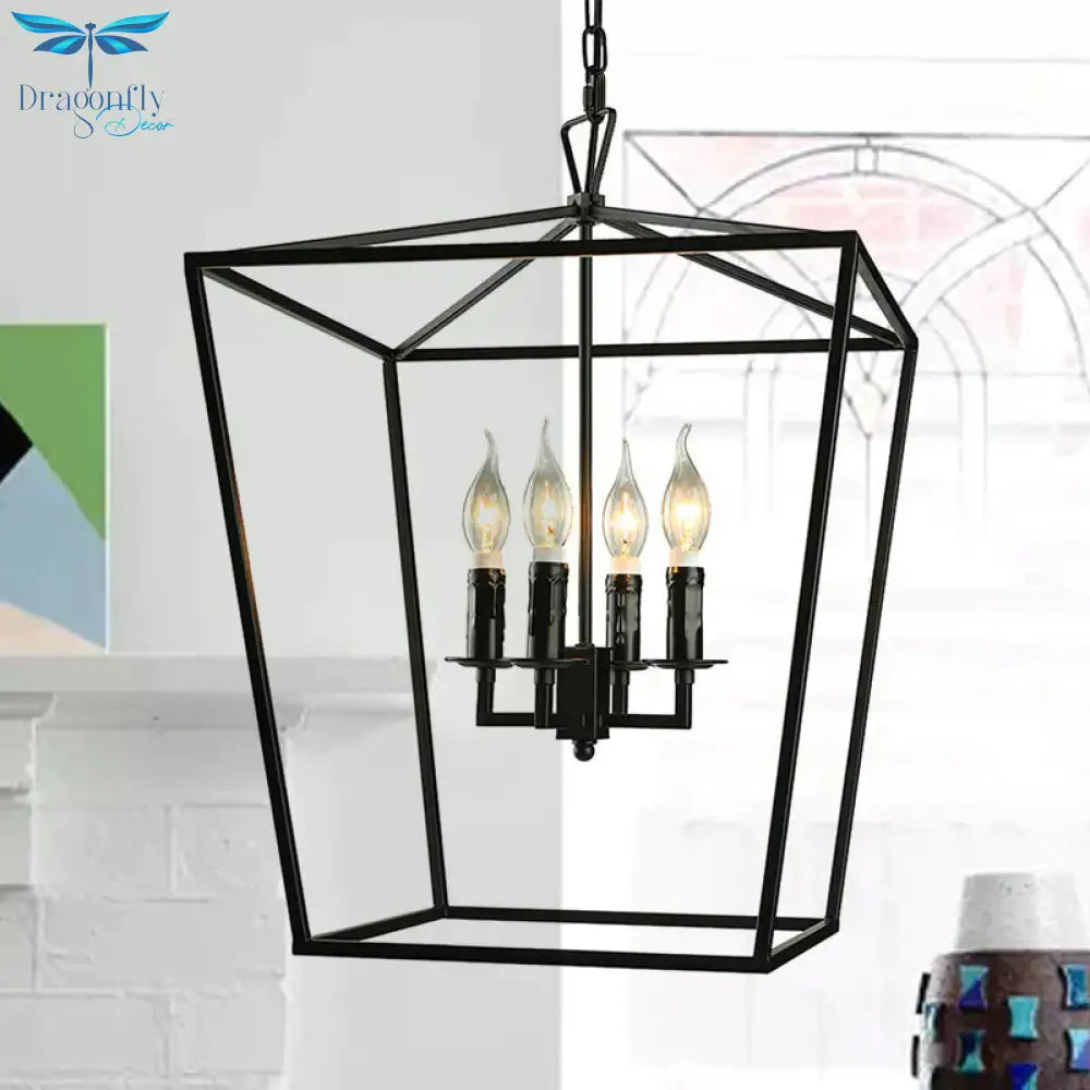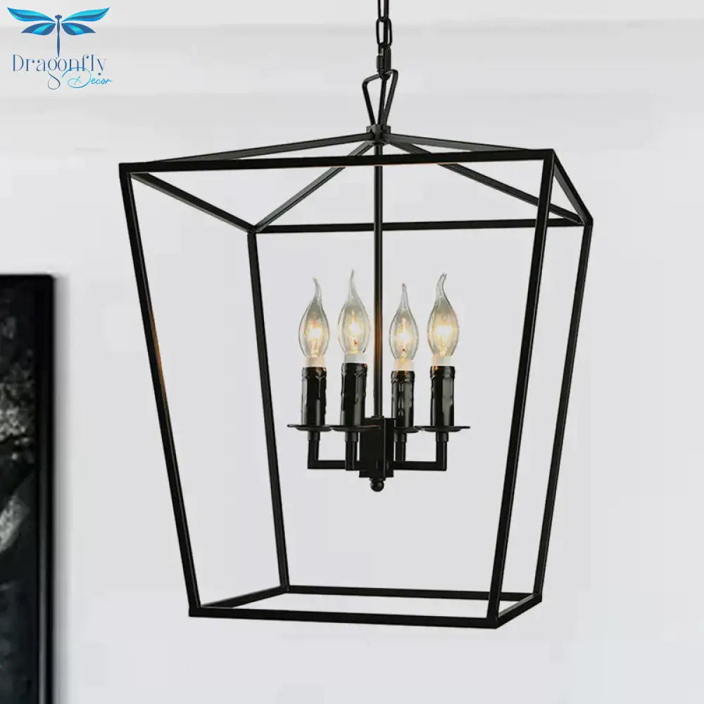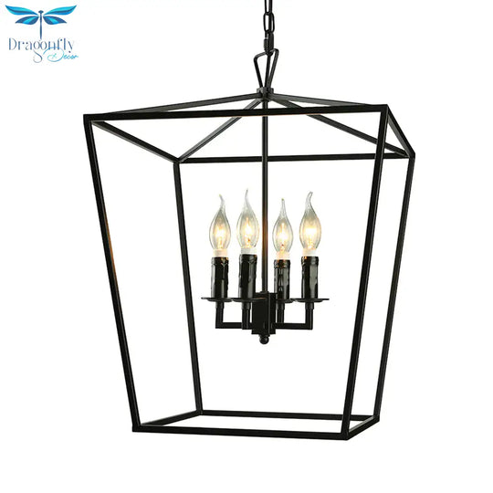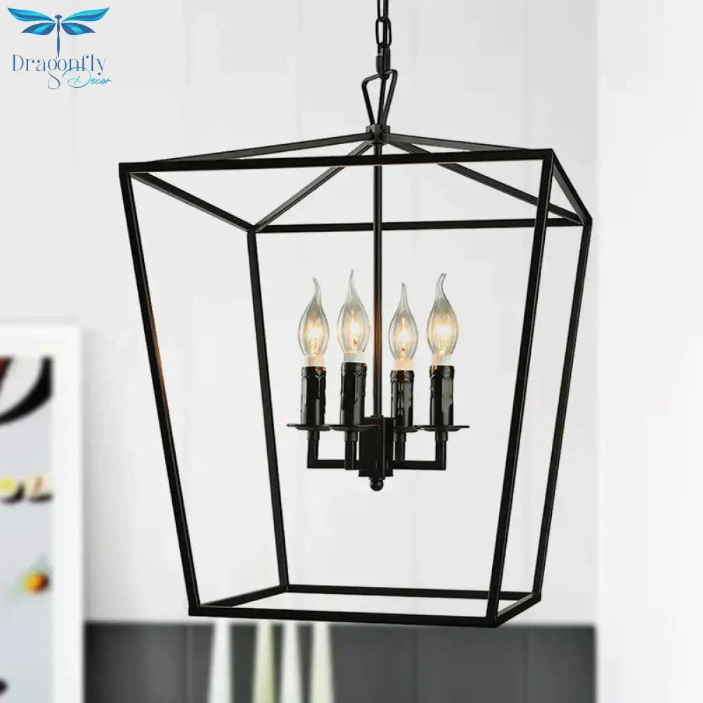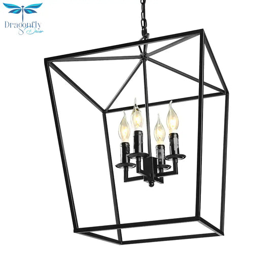 Vintage Squared Cage Chandelier Light Fixture with Candle 4-Light Wrought Iron Medium Ceiling Light in Black