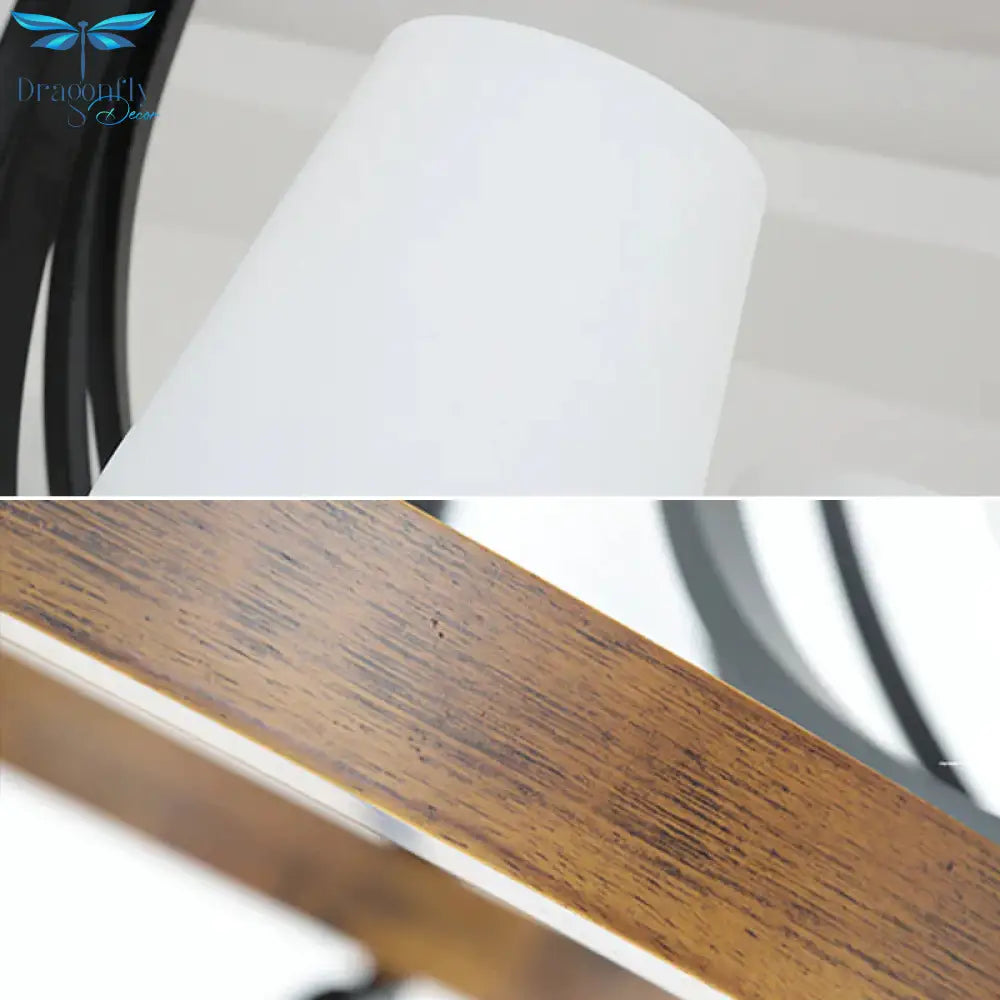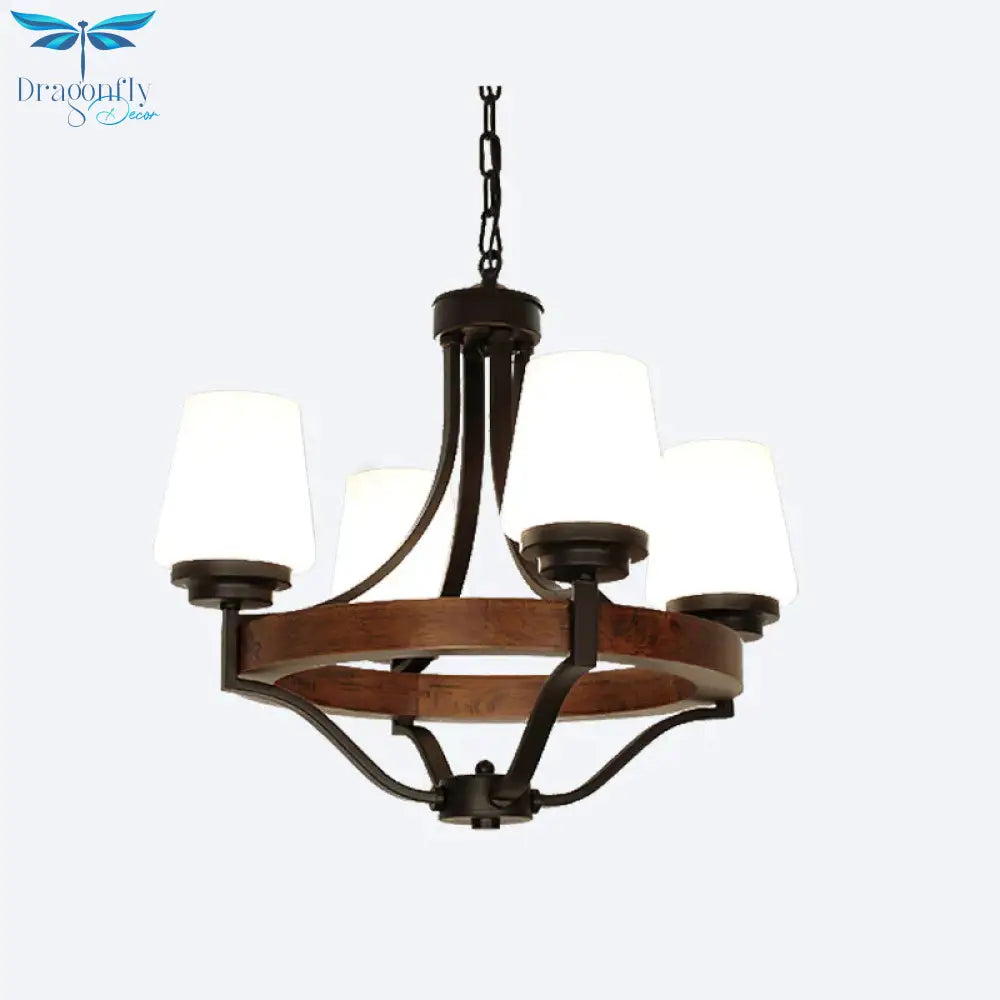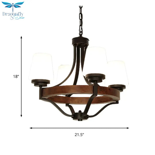 White Glass Cone Ceiling Light Fixture Rustic 4 Lights Dining Light Chandelier Light with Wooden Ring in Black
