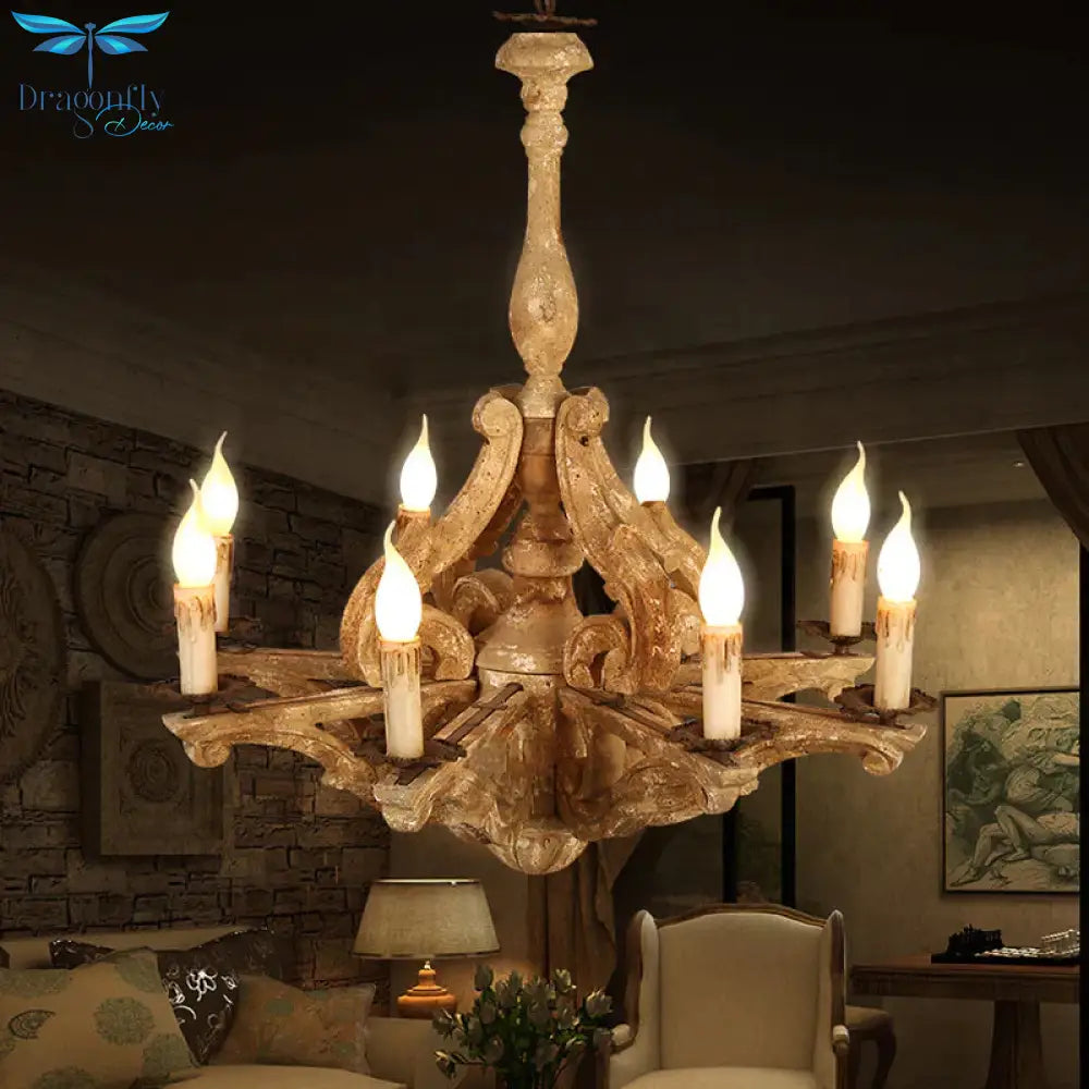 Wooden Candle Chandelier Lamp Rustic 8-Head Restaurant Pendant Ceiling Light in Distressed White